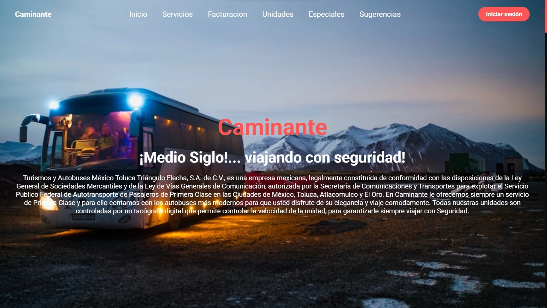 Con el proposito de elaborar una pagina web para la empresa de Caminante que es una empresa de autobuses con la finalidad de mostrar las rutas y la compra de boletos para viejes turisticos, privados o publicos